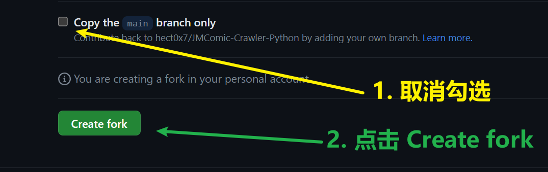 (最新提示,下图的1可以不做,即直接点绿色的Create fork按钮)
