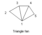 When rendering connected structures where all triangles share a common vertex a triangle fan can be used instead of a triangle list (d2_rendertrilist). The advantage is that for every triangle except the first one only one additional vertex has to be specified. The other two vertices are reused from the previous triangle and the common base vertex. See diagram for explanation: