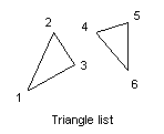 When rendering connected structures using a set of triangles a triangle strip can be used instead of a triangle list (d2_rendertrilist). The advantage is that for every triangle except the first one only one additional vertex has to be specified. The other two vertices are reused from the previous triangle. See diagram for explanation: